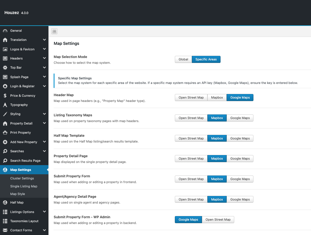 Choose the best map provider for each part of your site, from global settings down to individual templates like property detail pages, search results, and agent profiles.