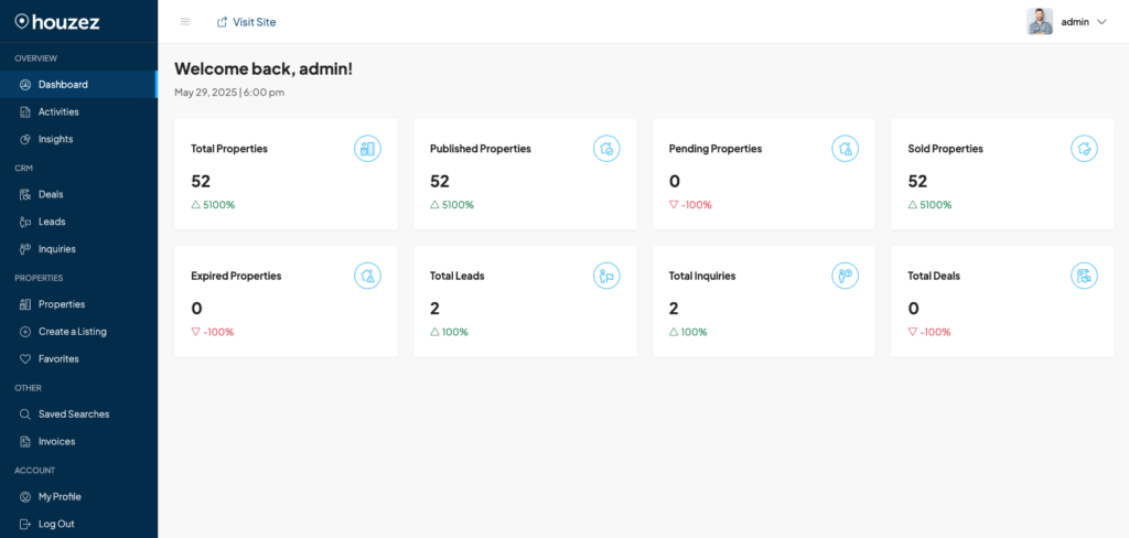 The updated layout is cleaner, more intuitive, and easier to navigate, helping users quickly access key metrics like listings, leads, inquiries, and deals. With subtle design enhancements and better spacing, it’s now simpler than ever to stay on top of your real estate activity.