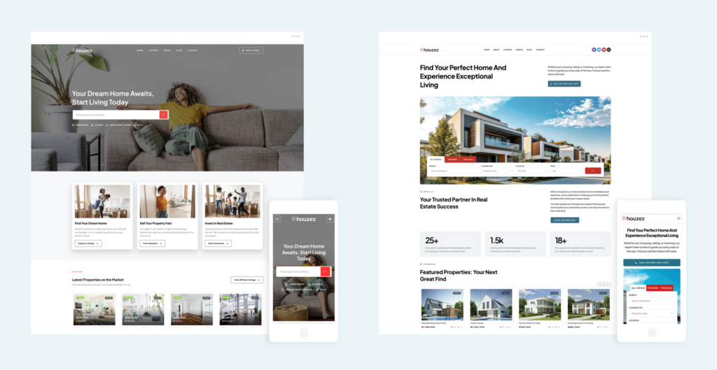 Our Houzez Studio Library is now better than ever. We added 10 new pages, including home pages, about pages, contact pages, as well as single agency, agent, and property pages. These assets give you more options to customize your site. This added flexibility helps you create a unique experience for your visitors, showcasing your brand’s value.