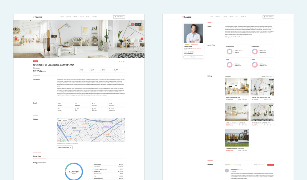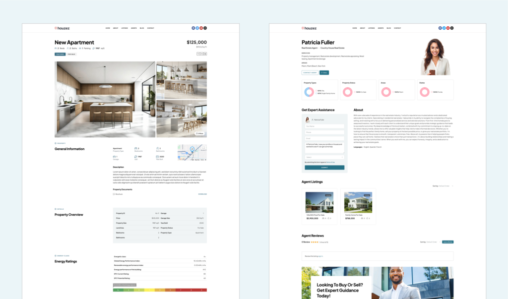 In the new demos, we present new templates created using the Houzez Page Builder, including single property pages, single agent profile pages, single agency profile pages, as well as new homepages, about us pages, and contact pages.